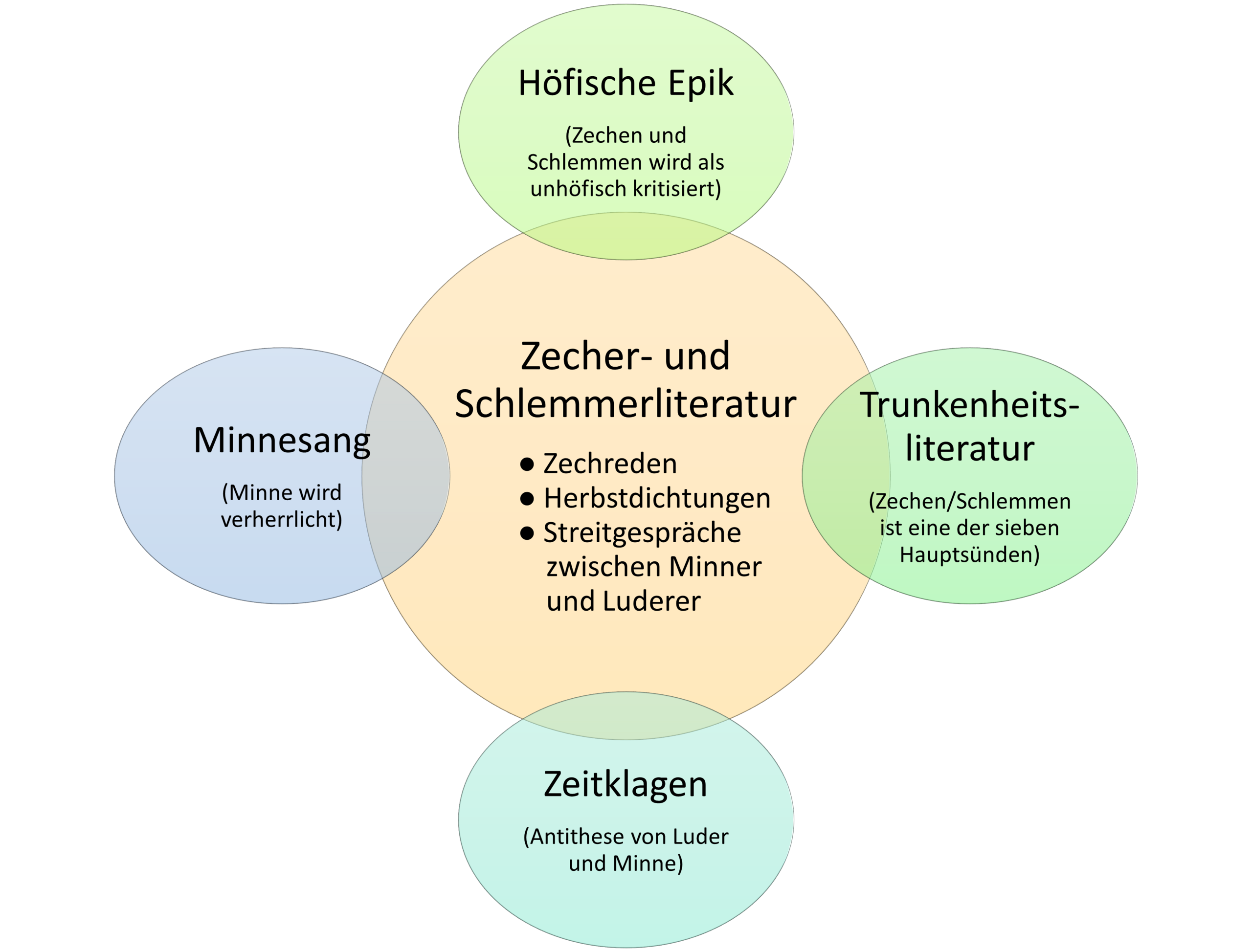 Überlappungen und Abgrenzungen der Zecher- und Schlemmerliteratur zu vier Nachbargattungen nach Grunewald, Eckhard: Die Zecher- und Schlemmerliteratur, S. 11-27