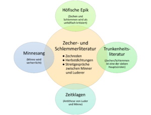 Zechreden sind Teil der Zecher- und Schlemmerliteratur. Eckhard Grunewald unterteilt die Zecher- und Schlemmerliteratur in drei Hauptrichtungen: Zechreden, Herbstdichtungen und Streitgespräche zwischen Minner und Luderer (Grunewald, Eckhard: Die Zecher- und Schlemmerliteratur, S. 28). Er definiert dabei die Zecher- und Schlemmerliteratur als Gegenentwurf zum traditionellen Minnesang: Im Minnesang wird in der Regel die Minne verherrlicht, in der Zecher- und Schlemmerliteratur wird die Minne verachtet, während das Luderleben gepriesen wird. Die Zechreden fokussieren dabei das Zechen und verwenden eine diskursive Form (Monolog): In den Zechreden "wird das Lob des Weins mit der Absage an Minne und Mai verbunden" (Grunewald, Eckhard: Die Zecher- und Schlemmerliteratur, S. 28). Zecher- und Schlemmerliteratur (und damit auch die Zechrede) besitzt inhaltlich Überschneidungsbereiche mit Höfischer Epik, Trunkenheitsliteratur, Zeitklagen und Minnesang (vgl. Graphik), ohne dass sie direkt aus einer dieser Quellen hergeleitet werden könnte (vgl. Grunewald, Eckhard: Die Zecher- und Schlemmerliteratur, S. 27).